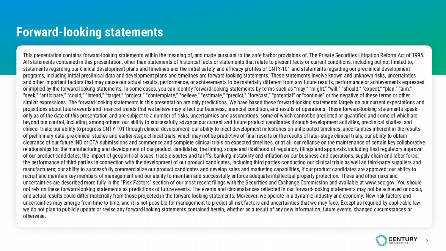 2 Forward - looking statements This presentation contains forward - looking statements within the meaning of, and made pursuant to the safe harbor provisions of, The Private Securities Litigation Reform Act of 1995. All statements contained in this presentation, other than statements of historical facts or statements that relate to present fa cts or current conditions, including but not limited to, statements regarding our clinical development plans and timelines and the initial safety and efficacy profiles of CNTY - 101 and s tatements regarding our preclinical development programs, including initial preclinical data and development plans and timelines are forward - looking statements. These statement s involve known and unknown risks, uncertainties and other important factors that may cause our actual results, performance, or achievements to be materially different from a ny future results, performance or achievements expressed or implied by the forward - looking statements. In some cases, you can identify forward - looking statements by terms such as “may,” “might,” “will,” “should,” “expect,” “plan,” “aim,” “seek,” “anticipate,” “could,” “intend,” “target,” “project,” “contemplate,” “believe,” “estimate,” “predict,” “forecast,” “p ote ntial” or “continue” or the negative of these terms or other similar expressions. The forward - looking statements in this presentation are only predictions. We have based these forward - looki ng statements largely on our current expectations and projections about future events and financial trends that we believe may affect our business, financial condition, and result s o f operations. These forward - looking statements speak only as of the date of this presentation and are subject to a number of risks, uncertainties and assumptions, some of which c ann ot be predicted or quantified and some of which are beyond our control, including, among others: our ability to successfully advance our current and future product candidates th rou gh development activities, preclinical studies, and clinical trials; our ability to progress CNTY - 101 through clinical development; our ability to meet development milestones on an ticipated timelines; uncertainties inherent in the results of preliminary data, pre - clinical studies and earlier - stage clinical trials, which may not be predictive of final results or the results of later - stage clinical trials; our ability to obtain clearance of our future IND or CTA submissions and commence and complete clinical trials on expected timelines, or at all; ou r r eliance on the maintenance of certain key collaborative relationships for the manufacturing and development of our product candidates; the timing, scope and likelihood of regulatory fi lings and approvals, including final regulatory approval of our product candidates; the impact of geopolitical issues, trade disputes and tariffs, banking instability and inflation o n o ur business and operations, supply chain and labor force; the performance of third parties in connection with the development of our product candidates, including third parties conduc tin g our clinical trials as well as third - party suppliers and manufacturers; our ability to successfully commercialize our product candidates and develop sales and marketing capabilities, if our product candidates are approved; our ability to recruit and maintain key members of management and our ability to maintain and successfully enforce adequate intellectual pro per ty protection. These and other risks and uncertainties are described more fully in the “Risk Factors” section of our most recent filings with the Securities and Excha nge Commission and available at www.sec.gov. You should not rely on these forward - looking statements as predictions of future events. The events and circumstances reflected in our forw ard - looking statements may not be achieved or occur, and actual results could differ materially from those projected in the forward - looking statements. Moreover, we operate in a dyn amic industry and economy. New risk factors and uncertainties may emerge from time to time, and it is not possible for management to predict all risk factors and uncertainti es that we may face. Except as required by applicable law, we do not plan to publicly update or revise any forward - looking statements contained herein, whether as a result of any new info rmation, future events, changed circumstances or otherwise.
