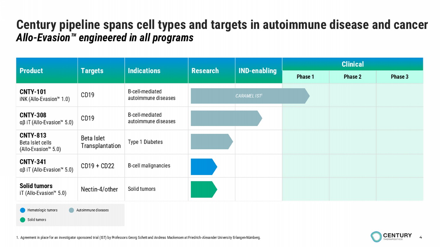 4 Clinical IND - enabling Research Indications Targets Product Phase 3 Phase 2 Phase 1 B - cell - mediated autoimmune diseases CD19 CNTY - 101 iNK (Allo - Evasion 1.0) B - cell - mediated autoimmune diseases CD19 CNTY - 308 αβ iT (Allo - Evasion 5.0) Type 1 Diabetes Beta Islet Transplantation CNTY - 813 Beta Islet cells (Allo - Evasion 5.0) B - cell malignancies CD19 + CD22 CNTY - 341 αβ iT (Allo - Evasion 5.0) Solid tumors Nectin - 4/other Solid tumors iT (Allo - Evasion 5.0) Century pipeline spans cell types and targets in autoimmune disease and cancer Allo - Evasion engineered in all programs CARAMEL IST 1 Hematologic tumors Solid tumors Autoimmune diseases 1. Agreement in place for an investigator sponsored trial (IST) by Professors Georg Schett and Andreas Mackensen at Friedrich - Alexander University Erlangen - Nürnberg.