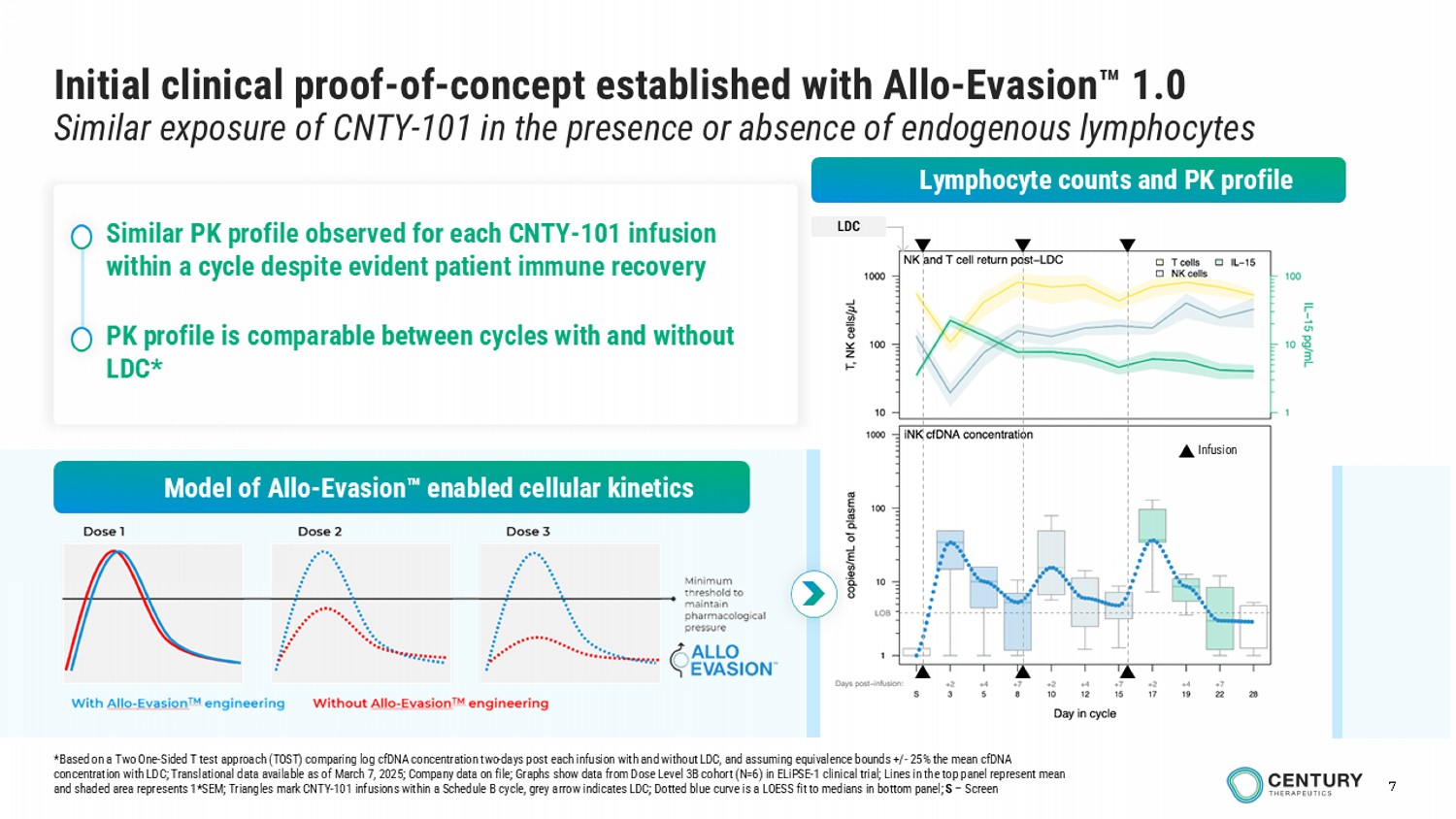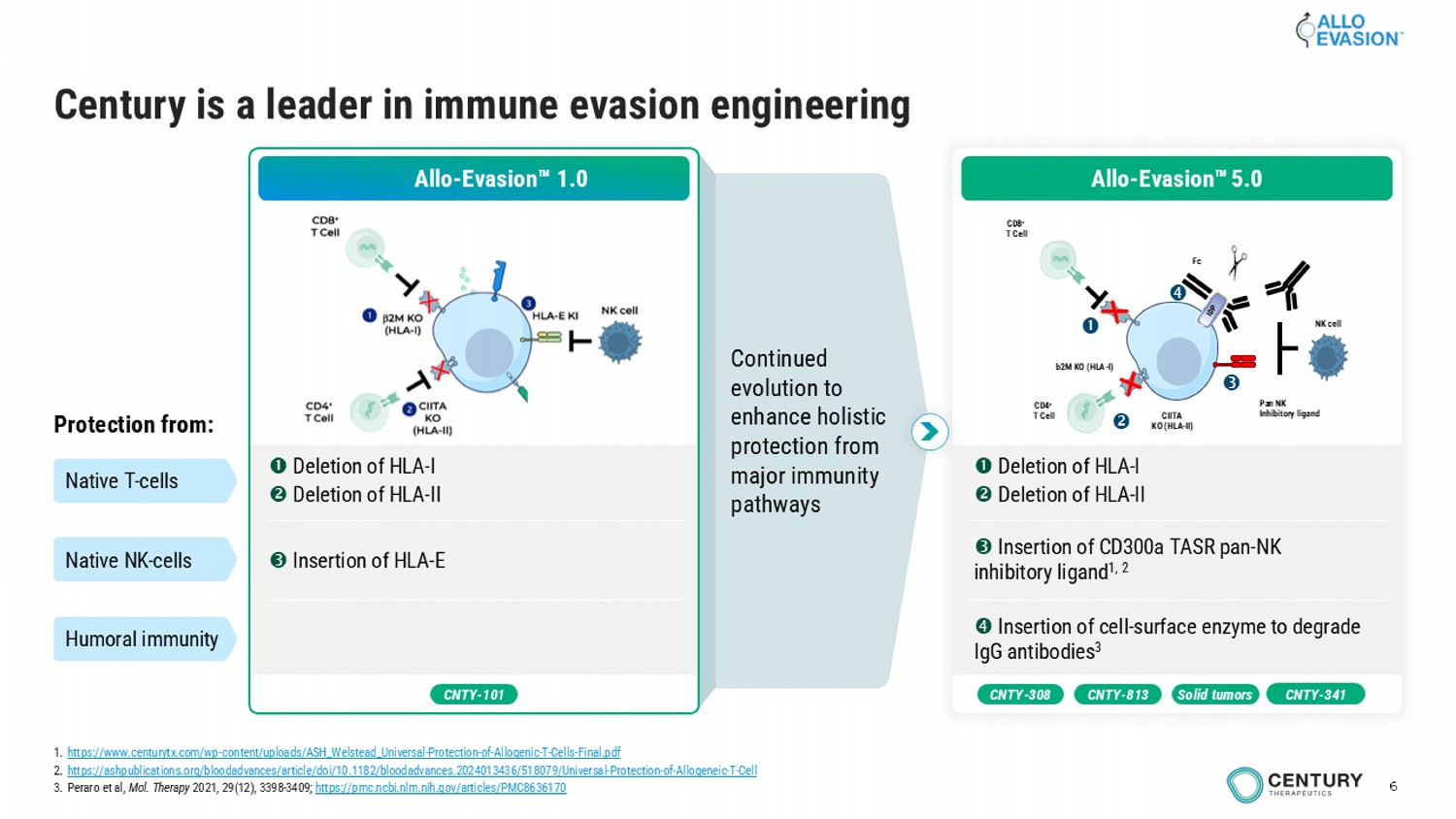 6 Continued evolution to enhance holistic protection from major immunity pathways Century is a leader in immune evasion engineering Allo - Evasion 1.0 Deletion of HLA - I Deletion of HLA - II Insertion of HLA - E Protection from: Native T - cells Native NK - cells Humoral immunity CNTY - 101 CNTY - 308 Solid tumors CNTY - 813 Deletion of HLA - I Deletion of HLA - II Insertion of CD300a TASR pan - NK inhibitory ligand 1, 2 Insertion of cell - surface enzyme to degrade IgG antibodies 3 b2M KO (HLA - I) CIITA KO (HLA - II) CD8 + T Cell CD4 + T Cell Pan NK Inhibitory ligand Fc NK cell Allo - Evasion 5.0 CNTY - 341 1. https://www.centurytx.com/wp - content/uploads/ASH_Welstead_Universal - Protection - of - Allogenic - T - Cells - Final.pdf 2. https://ashpublications.org/bloodadvances/article/doi/10.1182/bloodadvances.2024013436/518079/Universal - Protection - of - Allogeneic - T - Cell 3. Peraro et al, Mol. Therapy 2021, 29(12), 3398 - 3409; https://pmc.ncbi.nlm.nih.gov/articles/PMC8636170