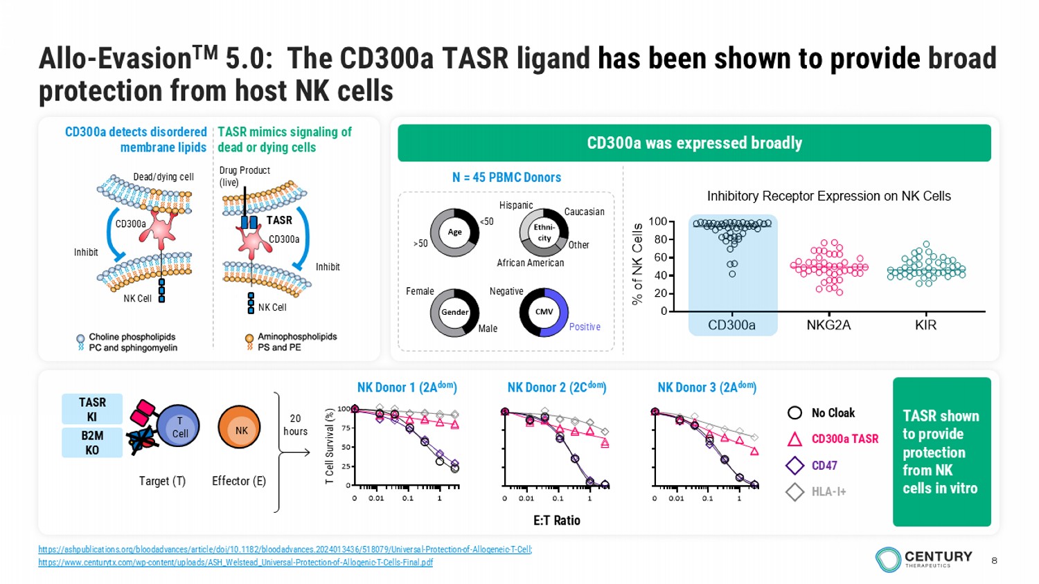 8 Allo - Evasion TM 5.0: The CD300a TASR ligand has been shown to provide broad protection from host NK cells Male Female <50 >50 Gender Age Ethni- city CMV Caucasian Other African American Hispanic Negative Positive N = 45 PBMC Donors 0.01 0.1 10 0.01 0.1 1 0 25 50 75 100 0 E:T Ratio T Cell Survival (%) 0.01 0.1 10 No Cloak CD300a TASR CD47 HLA - I+ 20 hours Target (T) T Cell NK Effector (E) CD300a NKG2A KIR 0 20 40 60 80 100 Inhibitory Receptor Expression on NK Cells (n = 46 donors) % o f N K C e l l s CD300a was expressed broadly CD300a detects disordered membrane lipids TASR mimics signaling of dead or dying cells Drug Product (live) Inhibit NK Cell TASR CD300a Dead/dying c ell NK Cell Inhibit CD300a TASR shown to provide protection from NK cells in vitro NK Donor 2 (2C dom ) NK Donor 1 (2A dom ) NK Donor 3 (2A dom ) TASR KI B2M KO https://ashpublications.org/bloodadvances/article/doi/10.1182/bloodadvances.2024013436/518079/Universal - Protection - of - Allogeneic - T - Cell ; https://www.centurytx.com/wp - content/uploads/ASH_Welstead_Universal - Protection - of - Allogenic - T - Cells - Final.pdf
