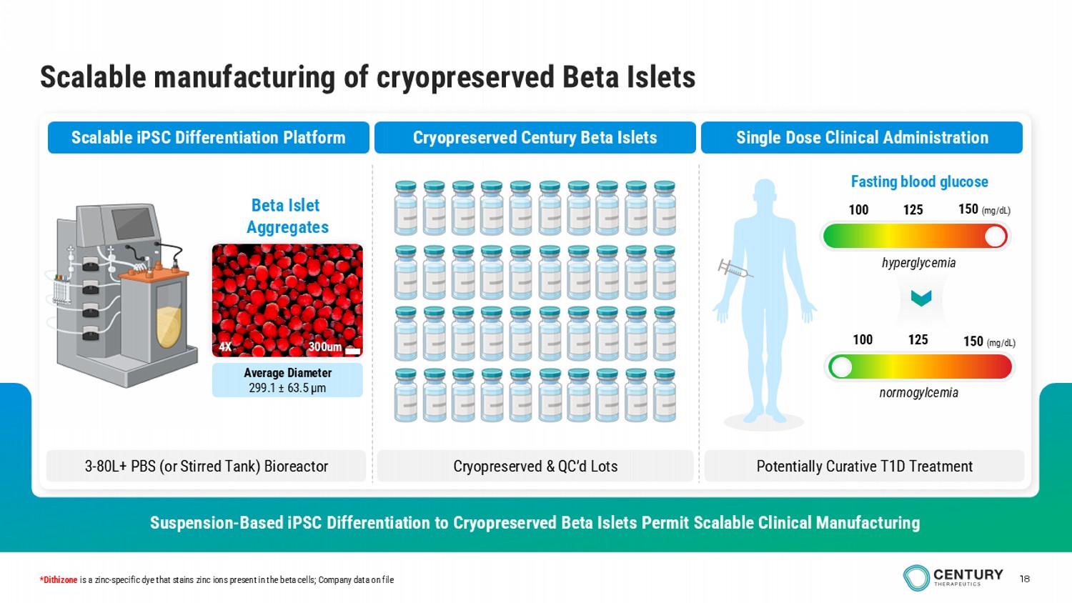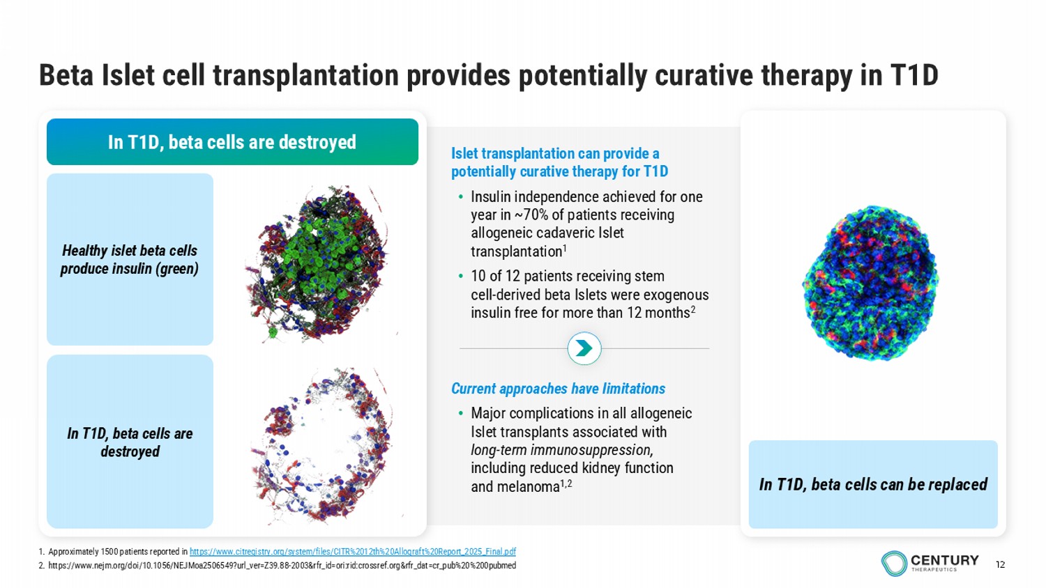 T1D affects approximately 9 million people worldwide, including approximately 2 million in the U.S., with a significant subset facing persistent hypoglycemia, glycemic variability, and long-term complications despite exogenous insulin. The current treatment of T1D also places a significant burden on the healthcare system, with approximately $6-8 billion spent on insulin annually in the U.S. A scalable, off-the-shelf, immune-evasion-enabled beta islet therapy could reach broad patient segments and expand access relative to donor-dependent transplantation or device-limited solutions. Century’s beta islet program is designed to combine clinical impact with a path to profitable scalability, supporting the potential for long-term value creation.
