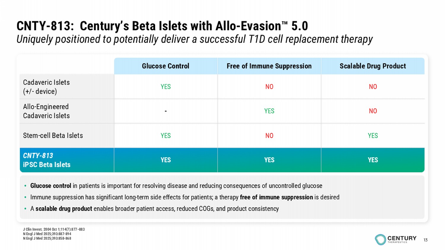 PHILADELPHIA, Nov. 13, 2025 -- Century Therapeutics, Inc. (‘Century’, NASDAQ: IPSC), a biotechnology company developing induced pluripotent stem cell (iPSC)-derived cell therapies for autoimmune diseases and cancer, today announced its first program for Type 1 diabetes (T1D), CNTY-813. The program comprises iPSC-derived beta islets engineered with the company’s proprietary Allo-Evasion™ 5.0 technology, designed to protect from T cell, NK cell and humoral immune rejection, with the goal of durable glycemic control without the need for systemic immunosuppression.