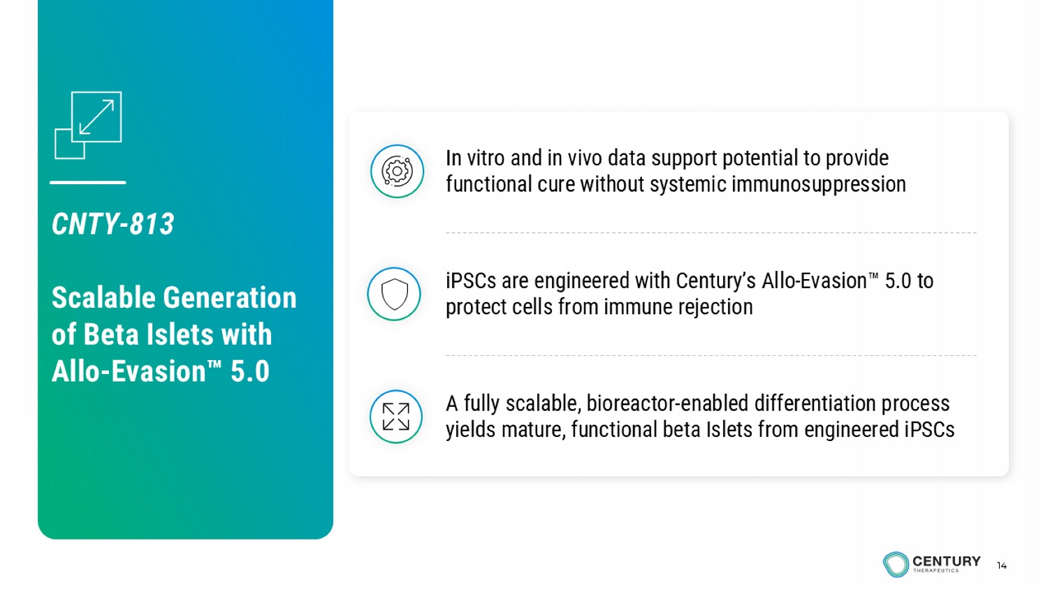 13 CNTY - 813: Century’s Beta Islets with Allo - Evasion 5.0 Uniquely positioned to potentially deliver a successful T1D cell replacement therapy • Glucose control in patients is important for resolving disease and reducing consequences of uncontrolled glucose • Immune suppression has significant long - term side effects for patients; a therapy free of immune suppression is desired • A scalable drug product enables broader patient access, reduced COGs, and product consistency Scalable Drug Product Free of Immune Suppression Glucose Control NO NO YES Cadaveric Islets (+/ - device) NO YES - Allo - Engineered Cadaveric Islets YES NO YES Stem - cell Beta Islets YES YES YES CNTY - 813 iPSC Beta Islets J Clin Invest. 2004 Oct 1;114(7):877 – 883 N Engl J Med 2025;393:887 - 894 N Engl J Med 2025;393:858 - 868