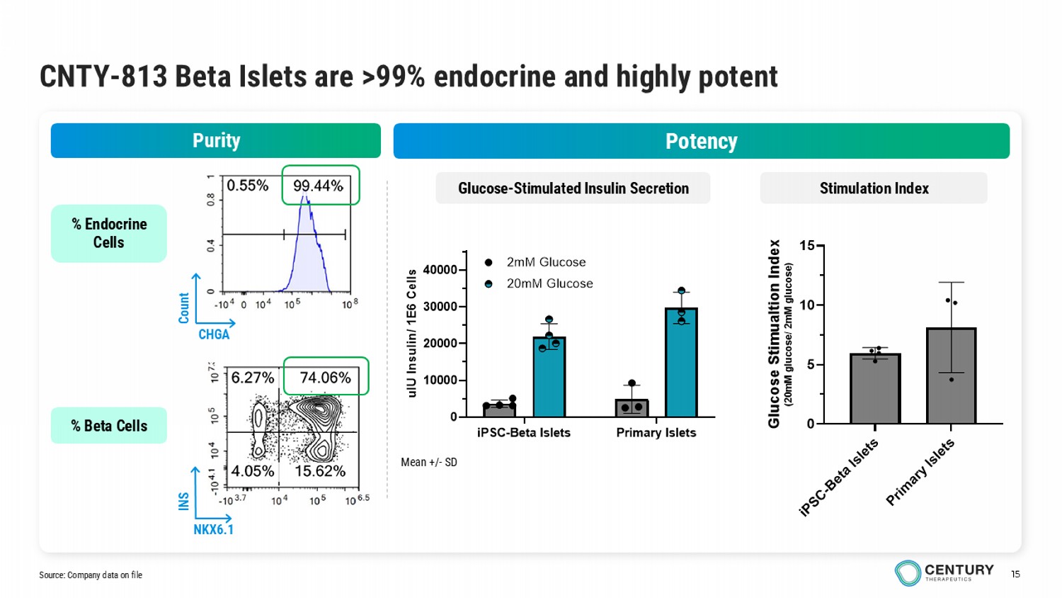 “Today we announced our iPSC derived beta islet program for T1D. We have generated a compelling preclinical data package that underscores the tremendous opportunity to potentially deliver a functional cure for T1D. We are moving with urgency and anticipate initiating IND-enabling studies by the end of 2025, with a projected IND submission as early as 2026. In parallel, we continue to advance CNTY-308 with plans to enter the clinic next year, supported by a strong and growing body of evidence from autologous CD19 CAR-T experience in autoimmune diseases,” said Brent Pfeiffenberger, Pharm.D., Chief Executive Officer of Century Therapeutics. “Our priority remains on developing innovative therapies for high-impact areas. Consequently, we are focusing our resources and expertise on these two programs. With our iPSC Cell Foundry, Allo-Evasion™ 5.0 technology, and manufacturing know-how, we believe Century is uniquely positioned to deliver potentially curative cell therapies, and we are eager to advance our lead programs into the clinic as soon as possible.”