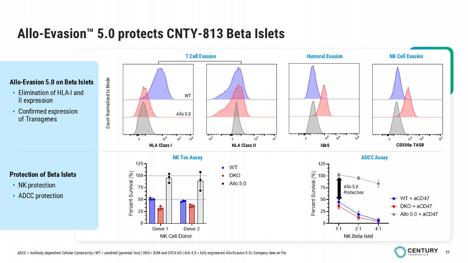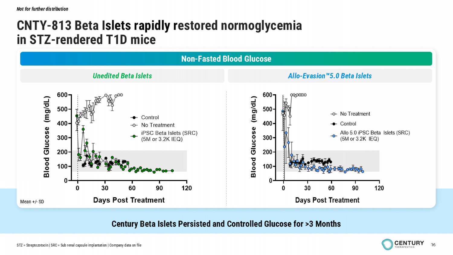 16 CNTY - 813 Beta I slets rapidly r estored normoglycemia in STZ - rendered T1D mice Not for further distribution Century Beta Islets Persisted and Controlled Glucose for >3 Months Non - Fasted Blood Glucose Unedited Beta Islets Allo - Evasion 5.0 Beta Islets 0 30 60 90 120 0 100 200 300 400 500 600 Days Post Treatment B l o o d G l u c o s e ( m g / d L ) No Treatment iPSC Beta Islets (SRC) (5M or 3.2K IEQ) Control 0 30 60 90 120 0 100 200 300 400 500 600 Days Post Treatment B l o o d G l u c o s e ( m g / d L ) No Treatment Allo 5.0 iPSC Beta Islets (SRC) (5M or 3.2K IEQ) Control STZ = Streptozotocin | SRC = Sub renal capsule implantation | Company data on file Mean +/ - SD