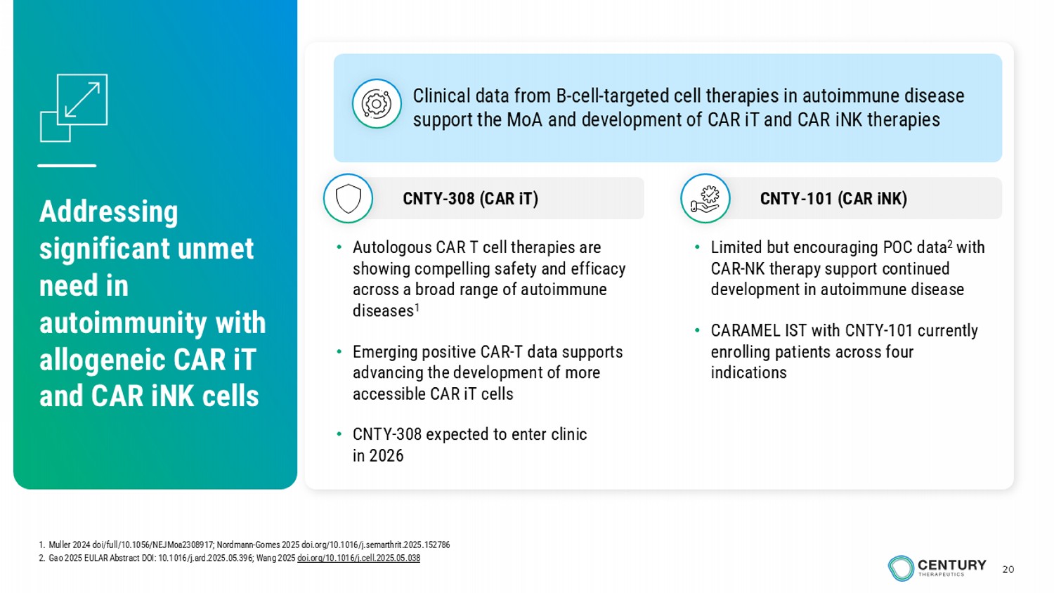 20 Addressing significant unmet need in autoimmunity with allogeneic CAR iT and CAR iNK cells • Limited but encouraging POC data 2 with CAR - NK therapy support continued development in autoimmune disease • CARAMEL IST with CNTY - 101 currently enrolling patients across four indications • Autologous CAR T cell therapies are showing compelling safety and efficacy across a broad range of autoimmune diseases 1 • Emerging positive CAR - T data supports advancing the development of more accessible CAR iT cells • CNTY - 308 expected to enter clinic in 2026 Clinical data from B - cell - targeted cell therapies in autoimmune disease support the MoA and development of CAR iT and CAR iNK therapies CNTY - 101 (CAR iNK ) CNTY - 308 (CAR iT ) 1. Muller 2024 doi /full/10.1056/NEJMoa2308917; Nordmann - Gomes 2025 doi.org/10.1016/j.semarthrit.2025.152786 2. Gao 2025 EULAR Abstract DOI: 10.1016/j.ard.2025.05.396; Wang 2025 doi.org/10.1016/j.cell.2025.05.038