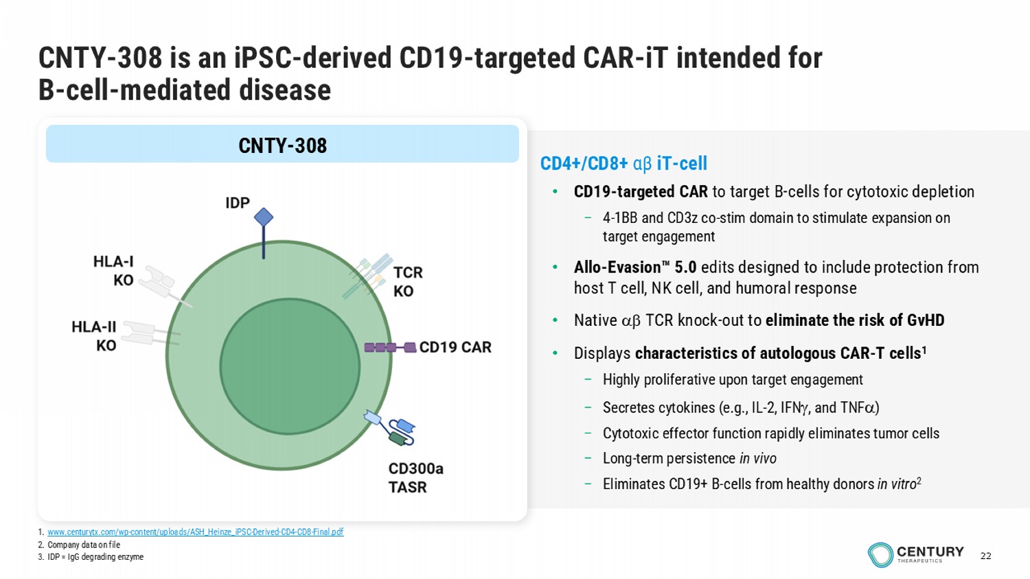 22 CNTY - 308 is an iPSC - derived CD19 - targeted CAR - iT intended for B - cell - mediated disease CNTY - 308 CD4+/CD8+ αβ iT - cell • CD19 - targeted CAR to target B - cells for cytotoxic depletion – 4 - 1BB and CD3z co - stim domain to stimulate expansion on target engagement • Allo - Evasion 5.0 edits designed to include protection from host T cell, NK cell, and humoral response • Native TCR knock - out to eliminate the risk of GvHD • Displays characteristics of autologous CAR - T cells 1 – Highly proliferative upon target engagement – Secretes cytokines (e.g., IL - 2, IFN , and TNF ) – Cytotoxic effector function rapidly eliminates tumor cells – Long - term persistence in vivo – Eliminates CD19+ B - cells from healthy donors in vitro 2 1. www.centurytx.com/wp - content/uploads/ASH_Heinze_iPSC - Derived - CD4 - CD8 - Final.pdf 2. Company data on file 3. IDP = IgG degrading enzyme