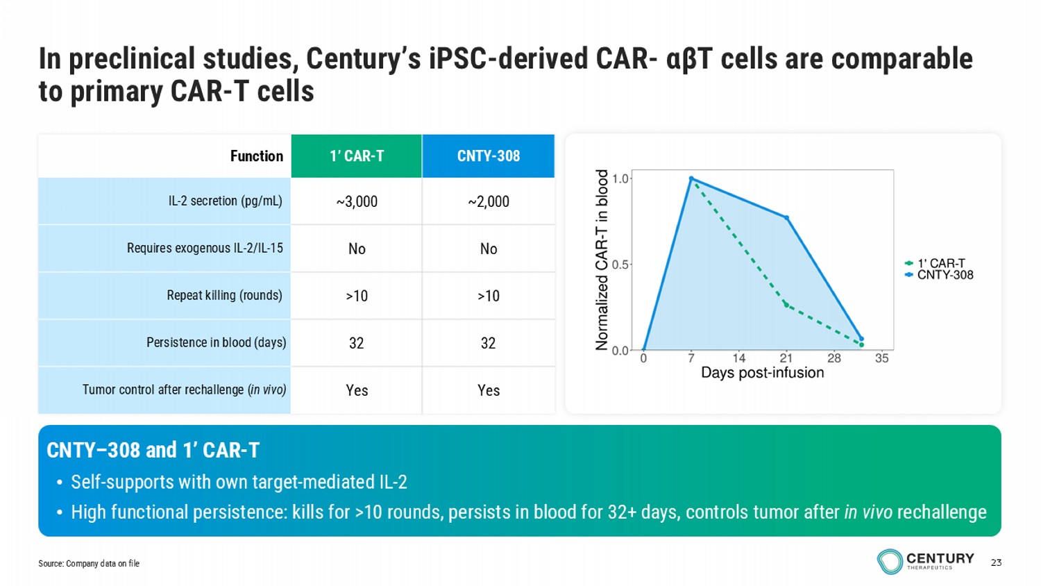 23 CNTY - 308 1’ CAR - T Function ~2,000 ~3,000 IL - 2 secretion (pg/mL) No No Requires exogenous IL - 2/IL - 15 >10 >10 Repeat killing (rounds) 32 32 Persistence in blood (days) Yes Yes Tumor control after rechallenge ( in vivo) CNTY – 308 and 1’ CAR - T • Self - supports with own target - mediated IL - 2 • High functional persistence: kills for >10 rounds, persists in blood for 32+ days, controls tumor after in vivo rechallenge In preclinical studies, Century’s iPSC - derived CAR - αβ T cells are comparable to primary CAR - T cells Source: Company data on file