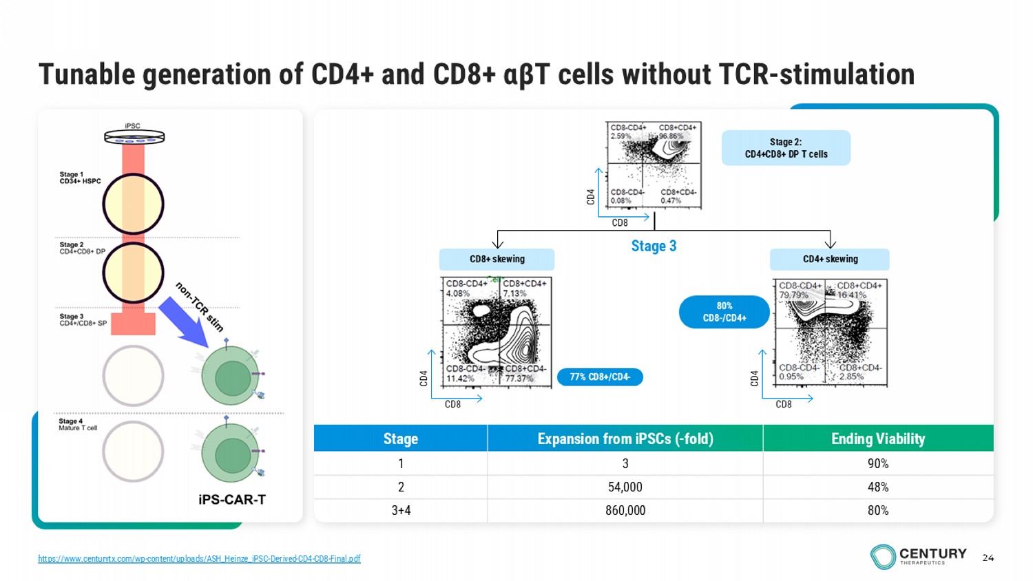 24 Tunable generation of CD4+ and CD8+ αβT cells without TCR - stimulation Ending Viability Expansion from iPSCs ( - fold) Stage 90% 3 1 48% 54,000 2 80% 860,000 3+4 77% CD8+/CD4 - CD8+ skewing CD4+ skewing Stage 3 Stage 2: CD4+CD8+ DP T cells CD8 CD4 CD8 CD4 CD8 CD4 80% CD8 - /CD4+ https://www.centurytx.com/wp - content/uploads/ASH_Heinze_iPSC - Derived - CD4 - CD8 - Final.pdf