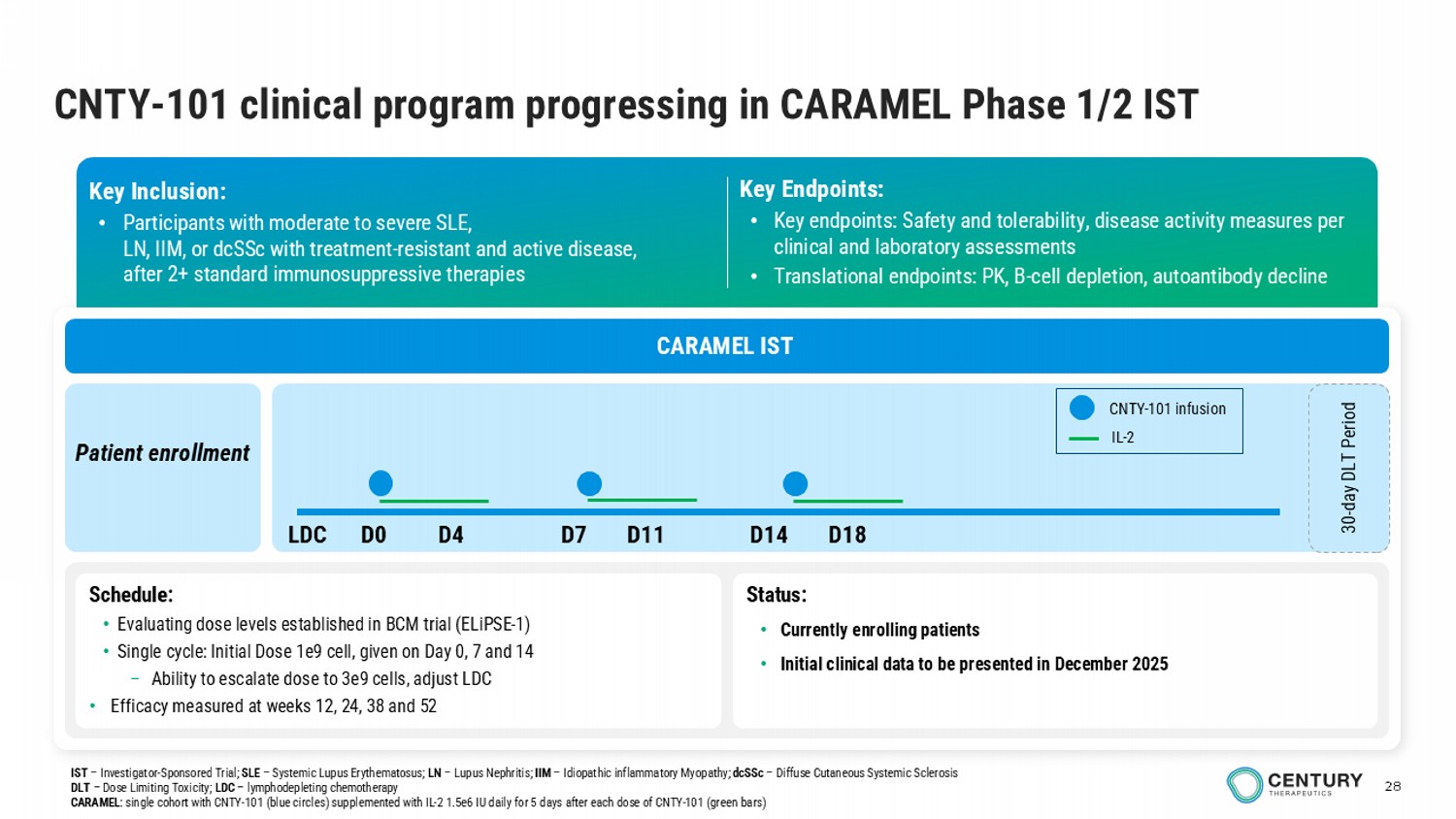 | · | Pursuing clinical advancement of CNTY-101 in CARAMEL IST with initial clinical data expected in December: Today, Century announced that CNTY-101 clinical development activities will continue in CARAMEL, a Phase 1/2 investigator-sponsored trial (IST) led by Professors Georg Schett and Andreas Mackensen and sponsored by the Friedrich-Alexander University Erlangen-Nürnberg. As of November 12, 2025, three B-cell-mediated autoimmune disease patients were treated in this IST. Initial clinical data from CARAMEL is expected to be presented by the trial investigators at the 14th Annual BMT & Cell Therapy Workshop on December 5, 2025. As part of the company’s clinical development re-prioritization efforts, Century will be discontinuing its company-sponsored CALiPSO-1 trial in which five patients have been treated with a favorable safety profile with no DLTs, no CRS >grade 2, and no ICANS. In addition, the limited but emerging clinical data suggests encouraging clinical activity in refractory patient populations. |