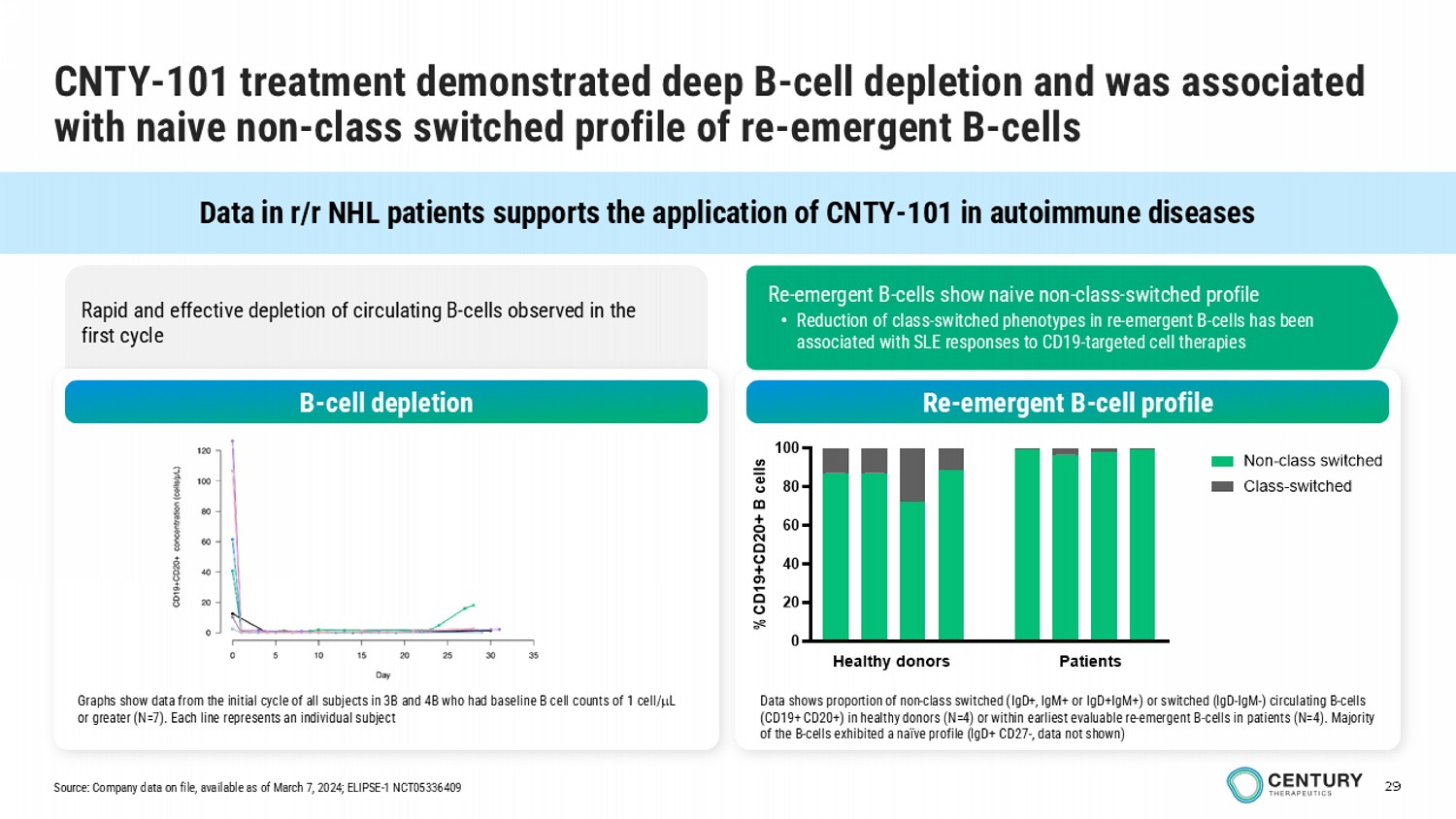 29 Data in r/r NHL patients supports the application of CNTY - 101 in autoimmune diseases Rapid and effective depletion of circulating B - cells observed in the first cycle CNTY - 101 treatment demonstrated deep B - cell depletion and was associated with naive non - class switched profile of re - emergent B - cells B - cell depletion Re - emergent B - cell profile Graphs show data from the initial cycle of all subjects in 3B and 4B who had baseline B cell counts of 1 cell/ L or greater (N=7). Each line represents an individual subject Data shows proportion of non - class switched ( IgD +, IgM+ or IgD+IgM +) or switched ( IgD - IgM - ) circulating B - cells (CD19+ CD20+) in healthy donors (N=4) or within earliest evaluable re - emergent B - cells in patients (N=4). Majority of the B - cells exhibited a naïve profile ( IgD + CD27 - , data not shown) Re - emergent B - cells show naive non - class - switched profile • Reduction of class - switched phenotypes in re - emergent B - cells has been associated with SLE responses to CD19 - targeted cell therapies Source: Company data on file, available as of March 7, 2024; ELIPSE - 1 NCT05336409