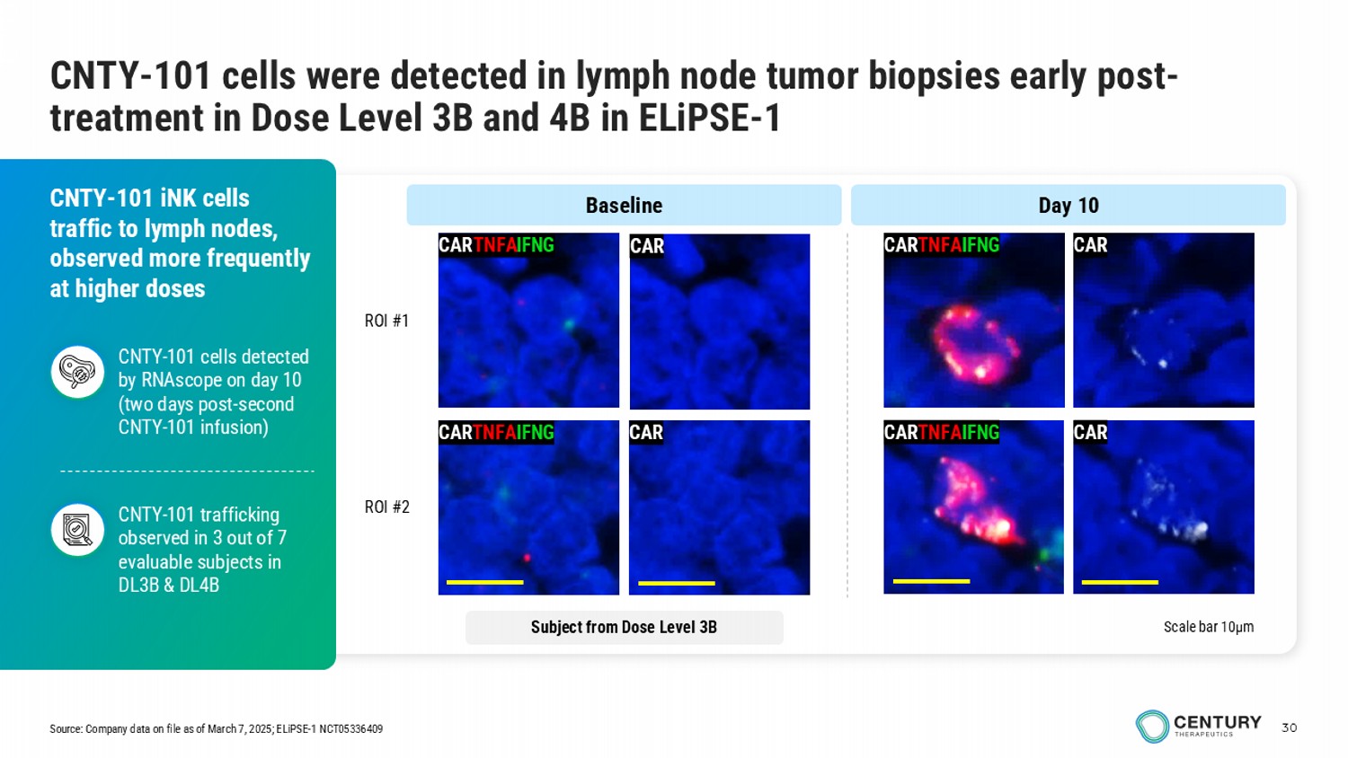 30 CNTY - 101 cells were detected in lymph node tumor biopsies early post - treatment in Dose Level 3B and 4B in ELiPSE - 1 CAR TNFA IFNG CAR TNFA IFNG CAR CAR Scale bar 10µm CNTY - 101 iNK cells traffic to lymph nodes, observed more frequently at higher doses CNTY - 101 trafficking observed in 3 out of 7 evaluable subjects in DL3B & DL4B CNTY - 101 cells detected by RNAscope on day 10 (two days post - second CNTY - 101 infusion) ROI #1 ROI #2 CAR TNFA IFNG CAR CAR TNFA IFNG CAR Subject from Dose Level 3B Baseline Day 10 Source: Company data on file as of March 7, 2025; ELiPSE - 1 NCT05336409