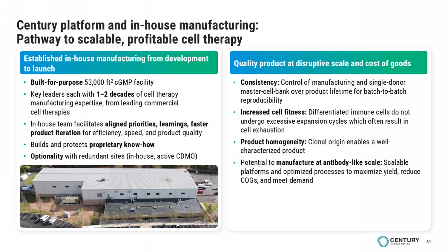 32 Century platform and in - house manufacturing: Pathway to scalable, profitable cell therapy Established in - house manufacturing from development to launch Quality product at disruptive scale and cost of goods • Built - for - purpose 53,000 ft 2 cGMP facility • Key leaders each with 1 – 2 decades of cell therapy manufacturing expertise, from leading commercial cell therapies • In - house team facilitates aligned priorities, learnings, faster product iteration for efficiency, speed, and product quality • Builds and protects proprietary know - how • Optionality with redundant sites (in - house, active CDMO) • Consistency: Control of manufacturing and single - donor master - cell - bank over product lifetime for batch - to - batch reproducibility • Increased cell fitness: Differentiated immune cells do not undergo excessive expansion cycles which often result in cell exhaustion • Product homogeneity: Clonal origin enables a well - characterized product • Potential to manufacture at antibody - like scale: Scalable platforms and optimized processes to maximize yield, reduce COGs, and meet demand
