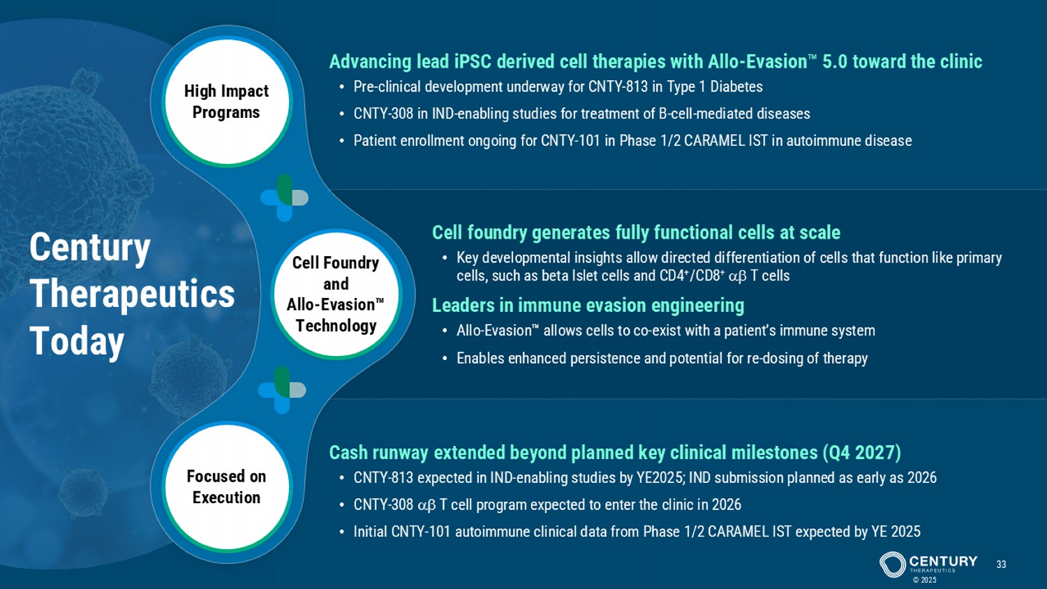 | · | Announced lead beta islet program, CNTY-813, for Type 1 diabetes: Today, Century announced its lead iPSC derived beta islet program for T1D. The company is leveraging its deep expertise in selective iPSC differentiation to advance this program, engineered with Allo-Evasion™ 5.0, toward clinical evaluation subject to regulatory clearance. Century has generated in vitro and in vivo data sets that validate a potentially best-in-class profile: rapid and sustained glucose control without the need for chronic immune suppression along with a scalable platform. Based on the company’s current timelines and expectations, the company is poised to move CNTY-813 into IND-enabling studies by the end of 2025 and anticipates submitting an IND as early as 2026. |
